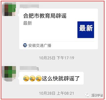 合肥闢謠的速度也挺令人佩服,比如10月25日上午,羣裏有一份文件在傳播,説27日恢復線下教學,下午安徽交通廣播的闢謠就來了。