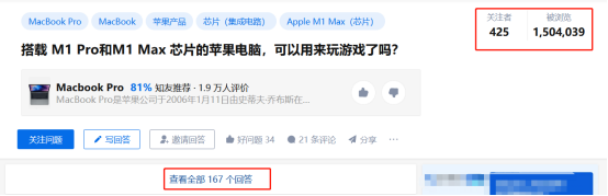 一個名為“搭載M1 Pro和M1 Max芯片的蘋果電腦,可以用來玩遊戲了嗎?”的問題,下面有多達167個回答,瀏覽量居然超過了150萬。