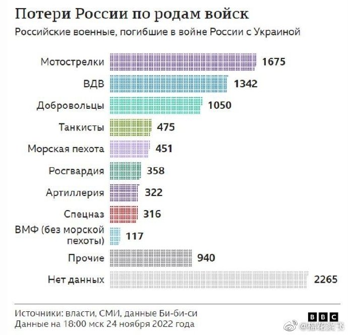 🌸截止到11月24日英國廣播公司(BBC )確認了在烏克蘭陣亡的 9311名俄羅斯軍人,統計表不包括民兵和僱傭軍。