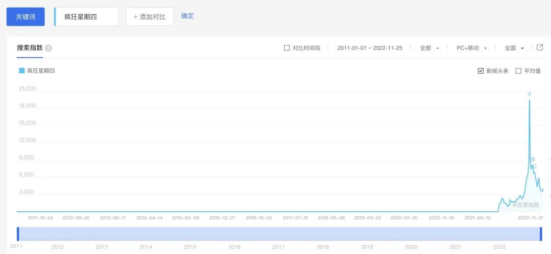 “瘋狂星期四”確實給肯德基的業績帶來了利好。根據百度指數,瘋狂星期四的高關注度出現在今年6月-9月,8月達到高峯,之後則迅速滑落並逐漸冷卻。