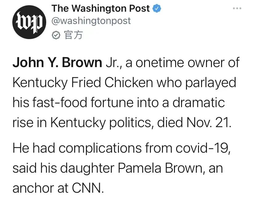 據《華盛頓郵報》報道,約翰·布朗於11月21日去世,享年88歲。在肯德基七十年的發展歷程中,有兩位重要的領路人:一位是肯德基創始人哈蘭·桑德斯,也就是花白鬍子的肯德基老爺爺,已經於上世紀八十年代去世;另一位就是帶領肯德基成功上市的約翰·布朗。