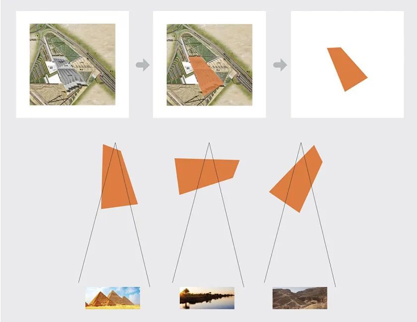 位置正面對着吉薩金字塔羣,三條軸線成放射狀延伸至附近三座金字塔。