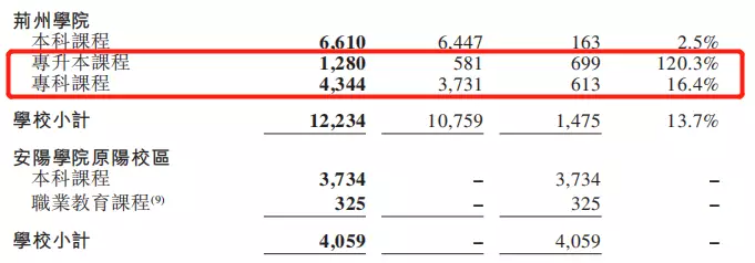 一方面,是招生規模的快速擴大。2015/2016學年——2021/2022學年,集團旗下學生總數從3.4萬人增長至9.8萬人,年平均增長率約20%。2021/2022學年,集團旗下商丘學院、安陽學院、商丘學院應用科技學院、荊州學院四所提供本科課程的院校總入學率為95.9%。本科課程在校生數量穩定之外,公告顯示,2021/2022學年專升本、專科及職業教育課程在校生數量也迅速增長,彰顯出中國春來品牌對學生的強大吸引力。