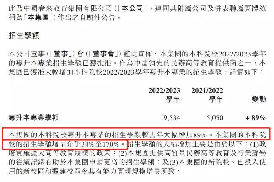 除了高就業率,新學年學額的大幅增加,也為中國春來招生創造了條件。公開資料顯示,2022/2023學年,中國春來的專升本專業招生學額大幅提升89%至9534人,本科招生學額增幅也在34%-170%之間。