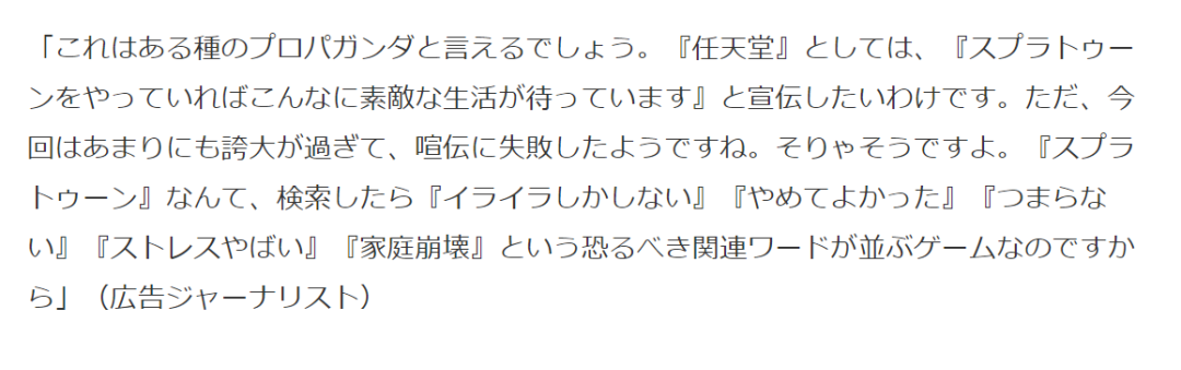 不光是玩家們這麼想,一位日本廣告記者也在簡單的搜索調查過後得出了自己的結論:“《斯普拉遁》通常伴隨着‘焦躁’‘壓力大’‘家庭崩壞’等恐怖的關聯詞,也難怪玩家們會產生這樣的反應。”