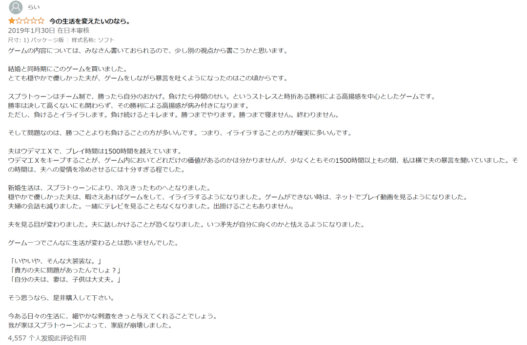 “家庭崩壞”並非聳人聽聞,早在《斯普拉遁2》時期,其在電商平台上就曾出現過一篇知名差評長文,這篇差評沒有對遊戲的質量做出評判,而是詳細描述了一位温柔沉穩的丈夫,在遊玩《斯普拉遁2》後沉淪為暴躁無趣的中年男人的過程。雖然大家無法核實事情的真偽,但還是有4000多個人認為這條評論“很有幫助”。