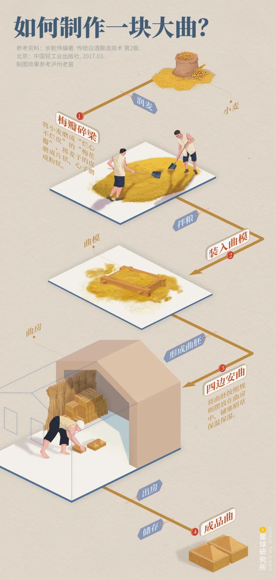 大麴製作工藝流程示意圖,宋元時期瀘州便開始以大麴釀酒 | 製圖@王天怡/星球研究所