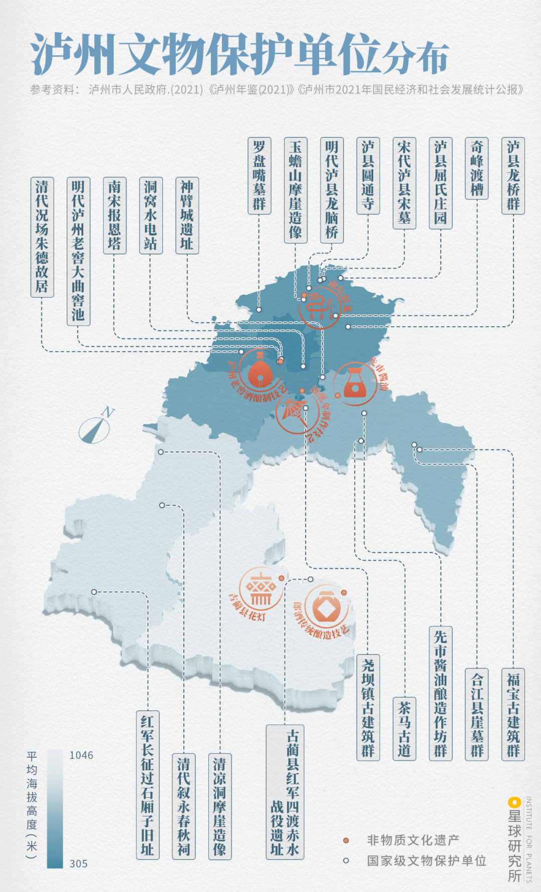 瀘州文物保護單位分佈圖,其中國家級文保單位共22處,省級58處,市級高達110處 | 製圖@吳昕恬/星球研究所