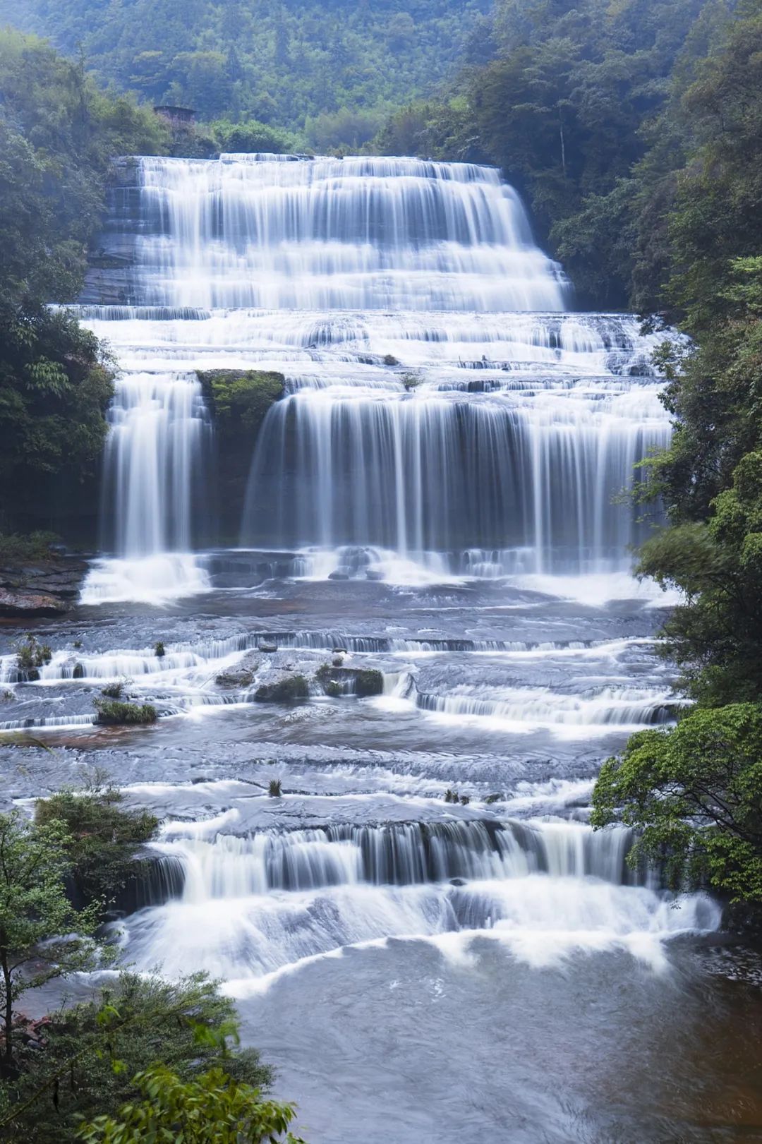 湍急的水流到丘陵地帶逐漸減緩,沿着錯落的山坡鋪上一層層水簾。