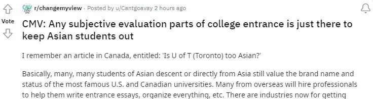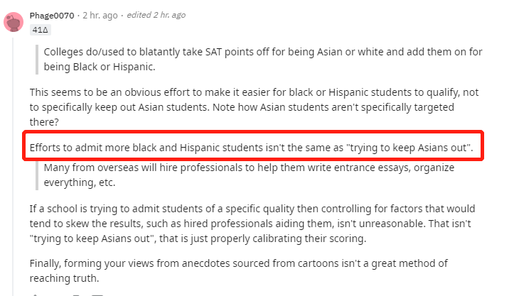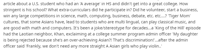 Cantgoavay説:“總之,完美的亞裔學生排起了長隊,而大學正在尋找藉口,不讓他們全部入學。而把其他種族的學生塞進來,就算這些學生在學校的表現並不出色,也沒有很多課外活動或任何申請。”“大學曾經明目張膽地對亞裔或白人扣減SAT分數,對黑人或西班牙裔加分。現在,他們會要求學生提供一個不幸的故事或類似的東西,而亞洲人似乎從來沒有在這一部分得到過好成績……”