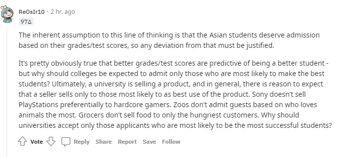 還有人提出了一個比較不同的觀點,大致意思是:學校想要的是多元文化,而不是最高的成績。“更好的成績/考試分數可以預測你是否能成為更好的學生,但為什麼要期望大學只錄取那些最有可能成為最好的學生的人?”“索尼公司不會把遊戲機優先賣給鐵桿遊戲玩家。動物園不會根據誰最喜歡動物來接納客人。雜貨店不會只向最飢餓的顧客出售食物。”