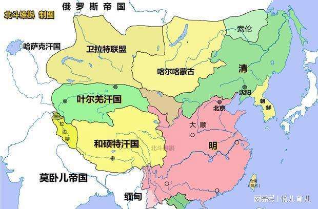 圖:清即將入關時的地圖。圖中的衞拉特聯盟就是後來的衞拉特國家——準噶爾汗國。如上圖所示,單單在現在的俄羅斯聯邦的那部分就有大幾十萬平方公里的面積。和碩特汗國也是蒙古人統治的國家,注意看地圖,和碩特汗國統治了現在四川的康區,距離成都只有小几十公里。明朝滅亡前,蒙古人的土地,除了雄踞中亞的蒙古族衞拉特聯盟,還有內蒙、外蒙、青海、西藏,遠比成吉思汗發家時僅有外蒙一地大得多,人口稀少、偏於西域的準噶爾汗國,也是清朝集合了內蒙、外蒙、八旗、綠營,耗時數十年才最後消滅,清初的準噶爾汗國也是英主迭出,如果不是滿族人統一中國,很大可能也是蒙古族統一中國。