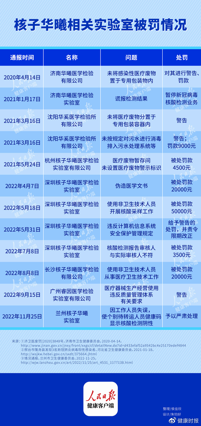 謊報檢測結果、使用非衞生技術人員開展核酸採樣工作、核酸檢測報告審核人與實際審核人不符……據人民日報健康客户端記者不完全梳理,核子華曦或其相關公司被衞生機構通報違規。