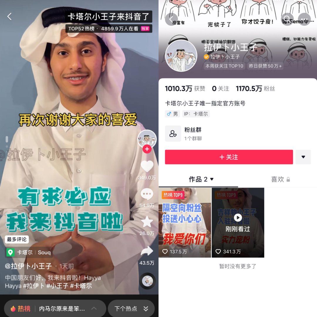 11月27日,因形似卡塔爾世界盃吉祥物,並以表情包走紅中國網絡的“卡塔爾小王子”入駐抖音平台。燃次元看到,截至11月28日18時,抖音平台上@拉伊卜小王子 賬號已有1170.5萬粉絲,其發佈的首個視頻也有341.3萬點贊,及53.7萬評論、42.8萬轉發。