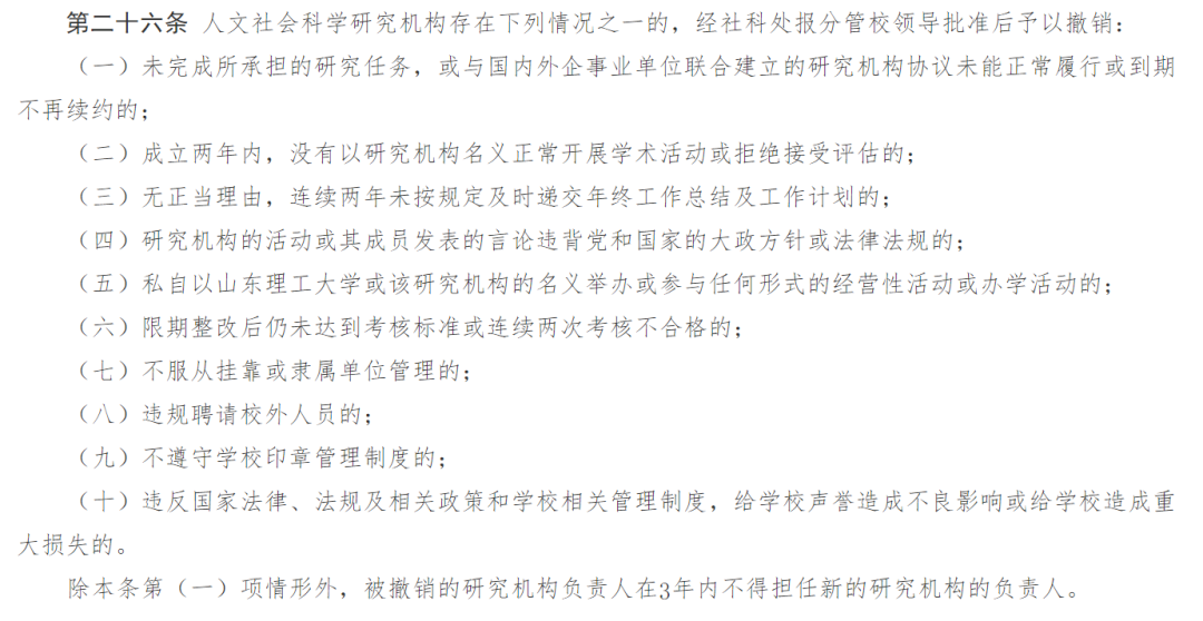 此外,今年7月,山東理工大學發佈《人文社會科學科研機構管理辦法(試行)》,對人文社會科學機構的設立、運行與管理、考核與評估等環節都做了嚴格的要求。