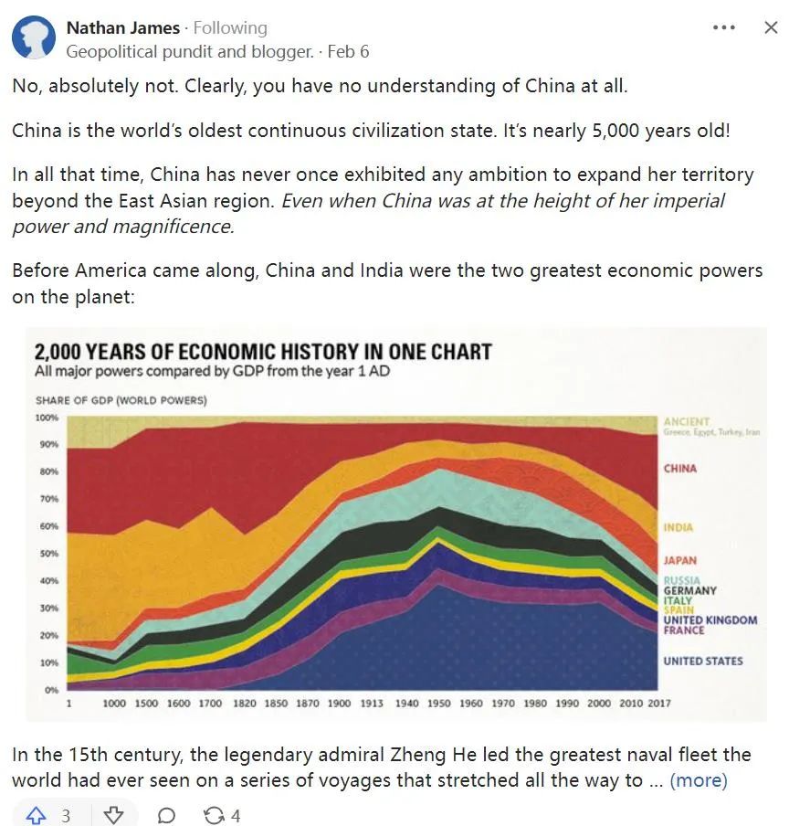四千年來,中國只在技術和貿易方面主宰了世界,並拒絕擴展成一個帝國。另一方面,美國在250年裏通過謀殺、種族滅絕、偷竊和破壞條約,幾乎偷走了整個大陸。如果我們目前對世界的統治不是如此執着於自殺,就不會如此令人不安。