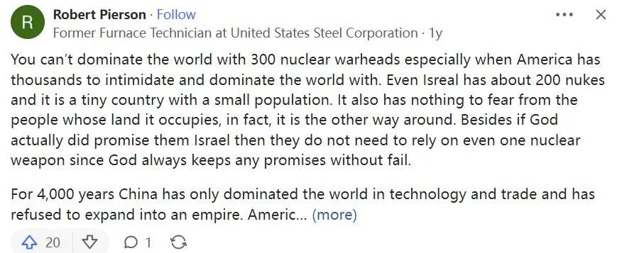 你不可能用300枚核彈頭來主宰世界,特別是當美國有數千枚核彈頭來恐嚇和主宰世界的時候。甚至以色列也有大約200枚核彈,而它是一個人口不多的小國。它也不需要害怕它所佔領的土地上的人民,事實上,情況恰恰相反。此外,如果上帝真的應許給他們以色列,那麼他們就不需要依靠哪怕是一件核武器,因為上帝總是不遺餘力地履行任何承諾。