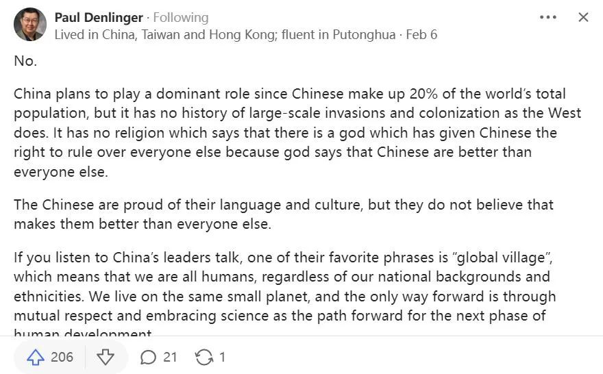 中國現在可能是最適合人民生活的國家之一,並且有一個良好的未來。但中國對主宰世界沒有興趣。提問者從哪裏得到這種想法?