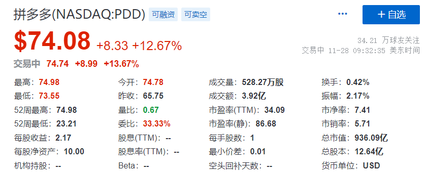 不過,這並不影響不少投資人因為這份財報對拼多多給予十足的信心。截止發稿前,雪球網顯示,拼多多開盤即達到74.08美元,漲超12.67%。