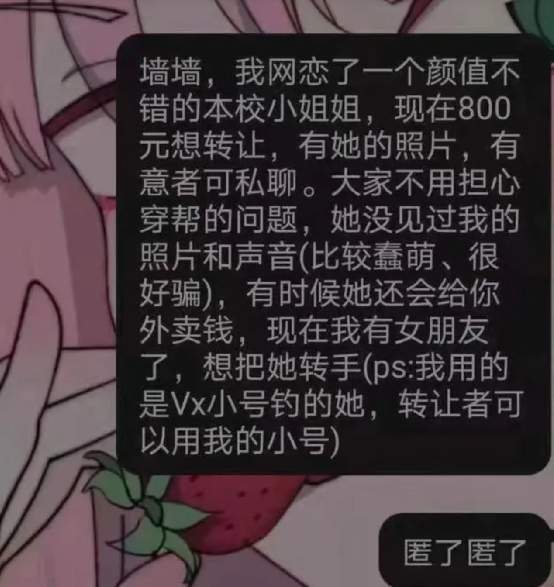 當然只是説會蹭點免費外賣還是有點“膚淺”了,這不要緊,“貼心”的網友會告訴你對方顏值不錯,只是自己有女朋友了不得不轉手,並暗示你有機會獲得“真愛”。