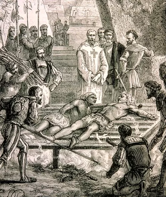 19世紀的雕版畫描繪歐洲征服者在1521年對阿茲特克皇帝夸特莫克(Aztec emperor Cuauhtemoc)施以酷刑
