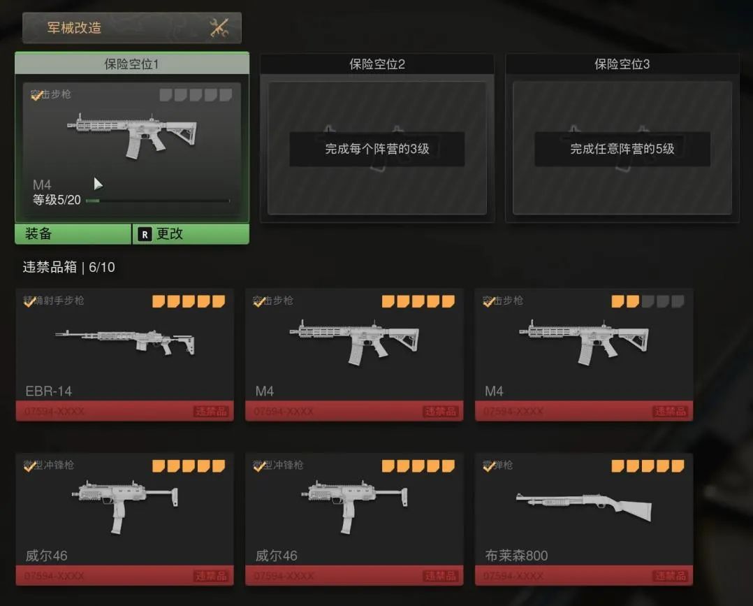 首先是為槍械準備的武器欄位。從無人區帶回來的槍械都會被打上“違禁品”的紅色標籤,違禁品最多保存10把,一旦我主動丟棄或未能成功撤離,就會徹底丟失。