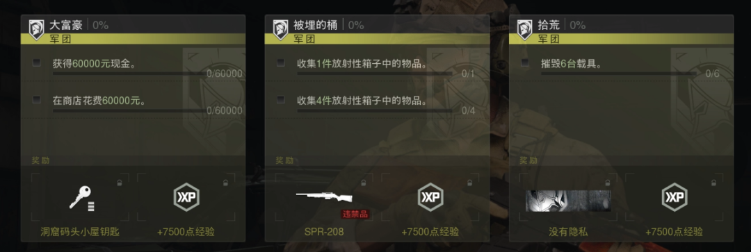 另一部分被設計為DMZ戰局外陣營任務系統的獎勵。無人區存在三個陣營,各自擁有數個陣營任務,完成這些任務會獲得違禁品武器、裝飾品與大量經驗值獎勵,最終能夠升級陣營聲望,拿到稀有的武器藍圖,解鎖更多保險庫欄位,以及新一批更復雜、更困難的任務。