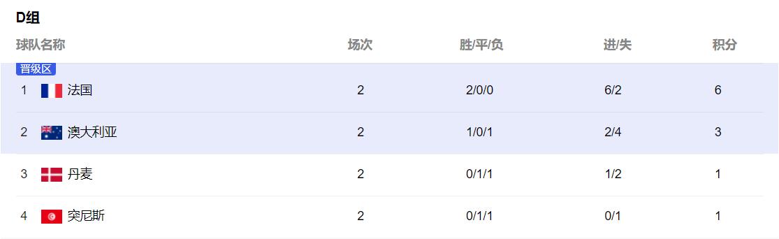 法國隊已經提前晉級,其餘三支球隊將為剩下的一個出線名額血拼,丹麥想要晉級,必須擊敗澳大利亞。