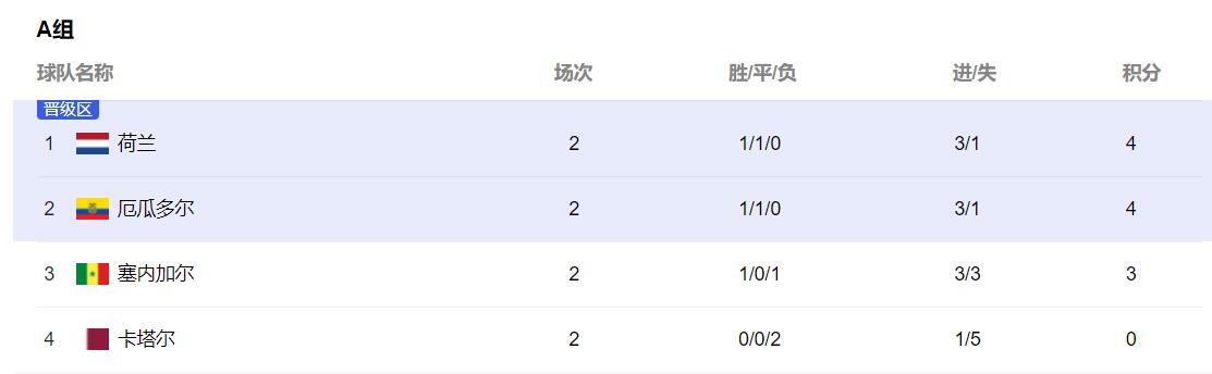荷蘭(4分)、厄瓜多爾(4分)、塞內加爾(3分)、卡塔爾(0分)。