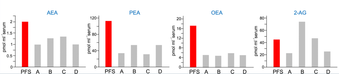 患者血液內循環花生酰胺(AEA)、棕櫚酰乙醇酰胺(PEA)、油酰乙醇胺(OEA)的濃度相比於其他四個正常對照要高出兩倍多。AEA、PEA和OEA均為FAAH的底物。|參考資料[1]