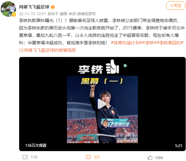 而最讓人驚訝的是,體育名記冉雄飛在微博上發文,有個國內資深的足球人向他爆料了李鐵的黑歷史。