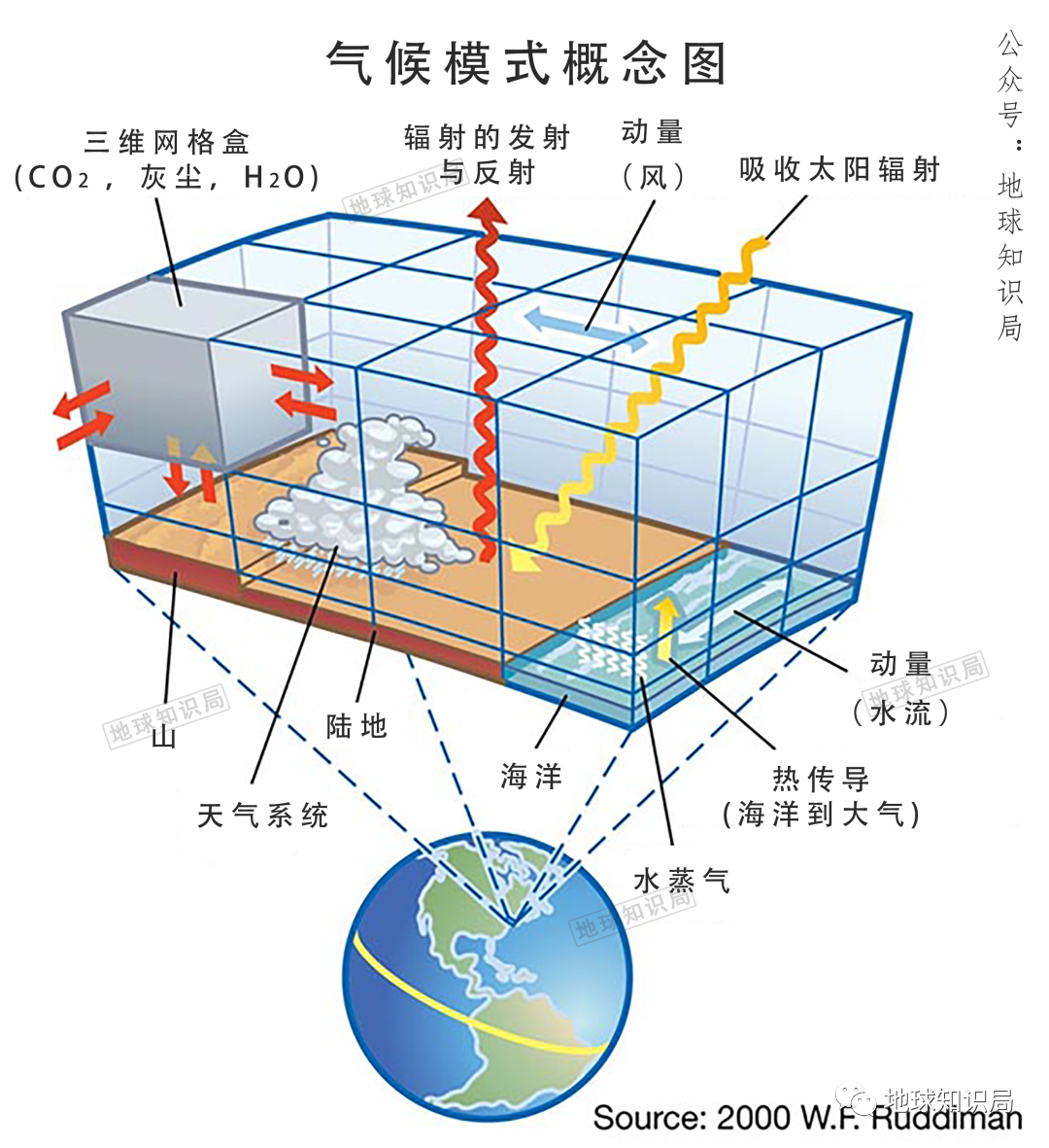 氣候模式是運行在計算機上的對地球氣候系統的仿真實驗室,它將氣候系統中重要的過程比如大氣和海洋環流、太陽輻射對大氣和陸面的加熱、大氣和陸地之間的能量交換和水分交換等抽象化、數學化和軟件化,給氣象學家們在虛擬的地球實驗室中做氣候試驗的機會。