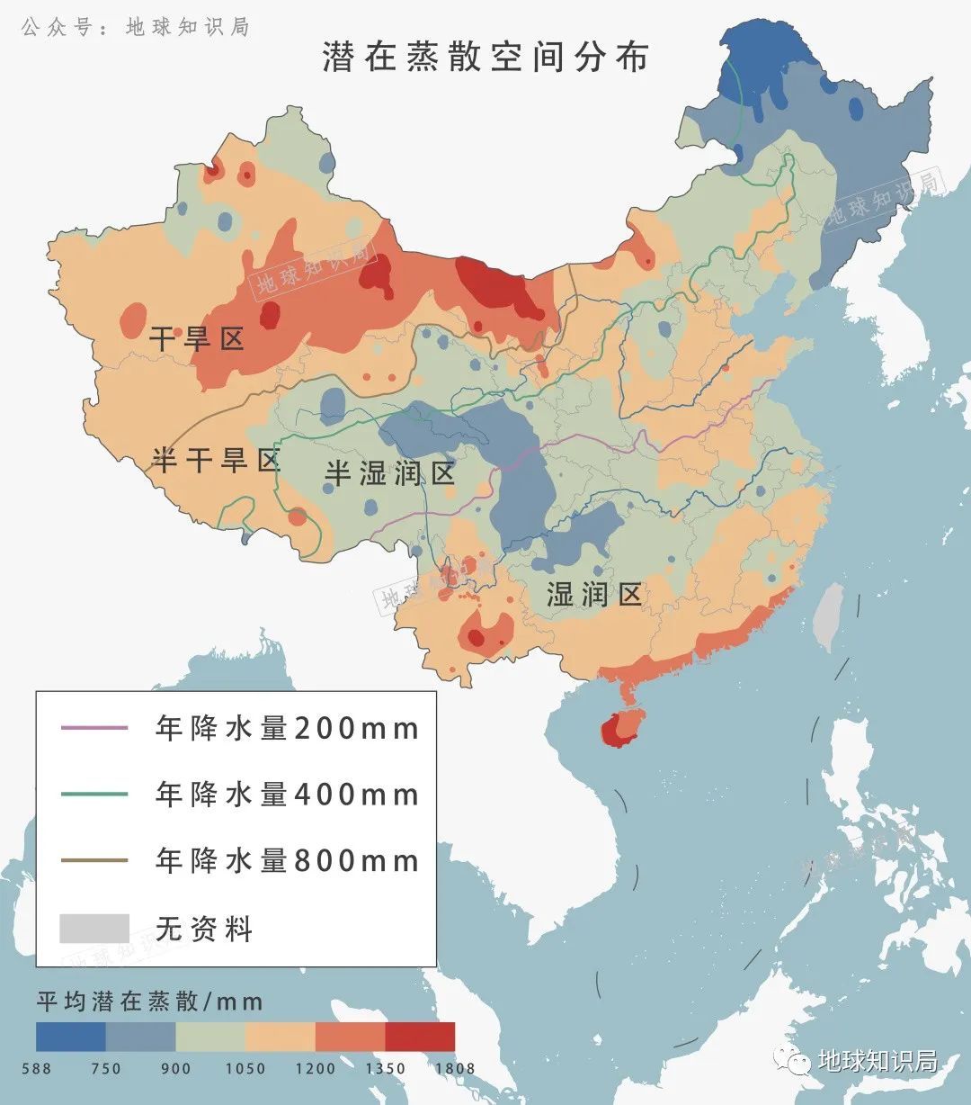 西北地區常有晴朗天氣,日照較強,潛在蒸散量很大,大部分地區超過了1000毫米,最大的地方超過了1800毫米。作為比較,長江中下游地區年平均降水量和潛在蒸發量相差不大,都在1000毫米以上。而西北地區的潛在蒸散量,在大部分地區都比降水量多800毫米以上。