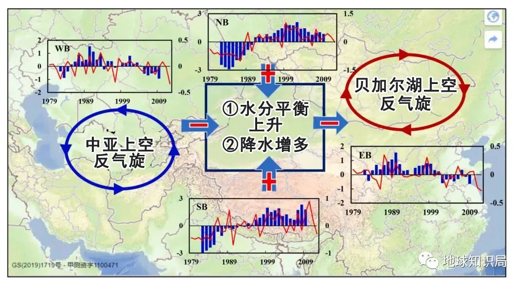 “外”指的是從海洋向西北地區輸送的水汽增加了,這些輸送又有不同的路徑。其中,來自大西洋水汽,更多地被高空更強的西風攜來;來自太平洋和印度洋的水汽增加,與西北太平洋副熱帶高壓的西伸和增強有關;來自北冰洋的水汽增加,則受到貝加爾湖上空的反氣旋環流增強控制,這同時也增強了來自北太平洋的水汽輸送。
