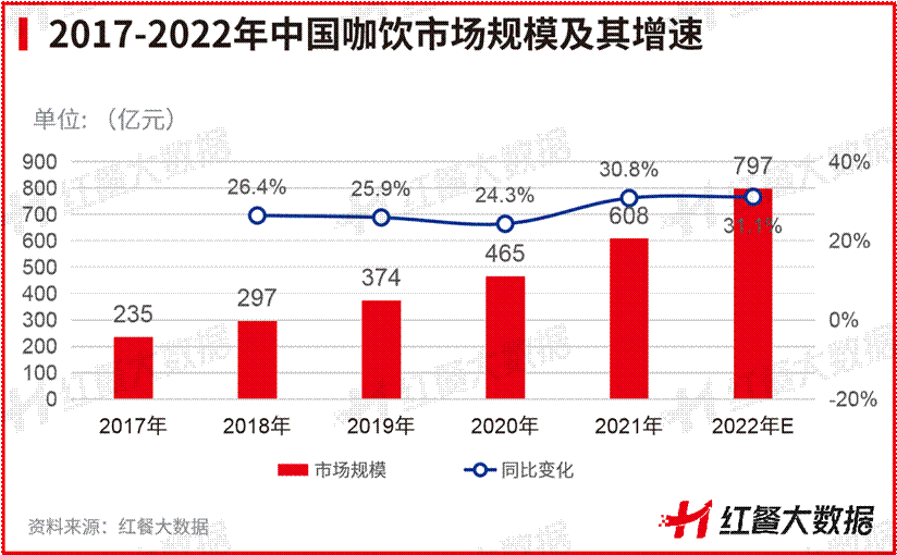 據紅餐品牌研究院近期發佈的《中國咖飲品類發展報告2022》顯示,2021年我國咖飲市場規模達到了608億元,較2020年增長30.8%。