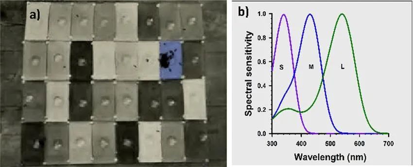 後來學者模仿弗裏希進行的實驗,可以看到蜜蜂降落在藍顏色的紙片上,以及實驗得到的蜜蜂彩色視覺範圍。圖片來源:參考文獻[1]