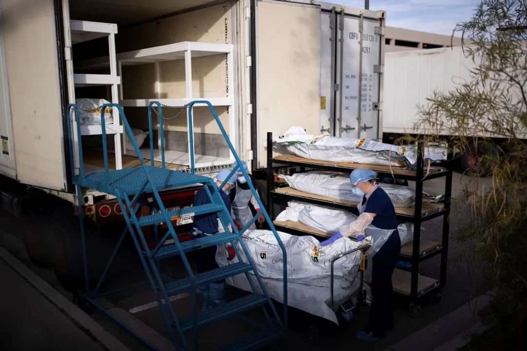 ▲2020年11月,美國得克薩斯州埃爾帕索法醫辦公室的工作人員搬運標有Covid標籤的屍體。