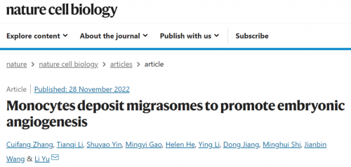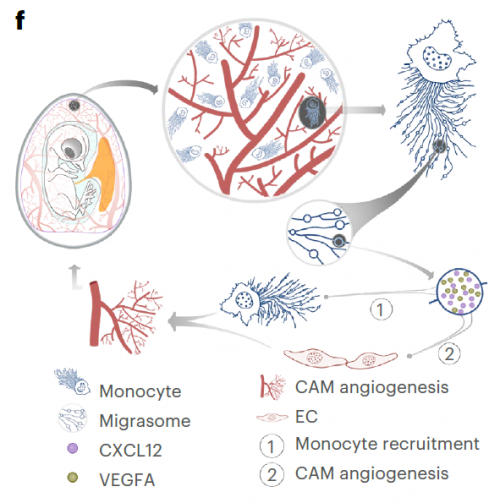 早在2014年,清華大學俞立團隊在 Cell Research 發表論文【1】,發現了一種新的細胞器——遷移體(Migrasome)。細胞遷移過程中在後面留下的一些彈性纖維(收縮絲),在彈性纖維的頂端或交叉處會生長出一些囊泡,這些囊泡也就是遷移體。細胞遷移過程中會通過收縮這些纖維的管道,持續把一些胞內物質運輸到遷移體中,隨後收縮纖維斷裂,遷移體被釋放,繼而被細胞外空間或周圍的細胞所攝取。研究表明,會動的細胞基本都有遷移體,但遷移體有哪些功能現在還不是很清楚。2021年5月,俞立團隊在 Cell 發表論文【2】,發現在細胞外的遷移體中存在線粒體,並進一步揭示了遷移體的功能——輕度線粒體應激後,受損的線粒體會被轉運到遷移體中,再被遷移體運送到細胞外。這一過程被命名為線粒體胞吐(Mitocytosis),是細胞對線粒體的一種質控過程,把受損的線粒體清理出去。2022年11月28日,清華大學俞立團隊在 Nature Cell Biology 期刊發表了題為:Monocytes deposit migrasomes to promote embryonic angiogenesis 的研究論文【3】。該研究在雞胚絨毛尿囊膜(CAM)上發現有高度遷移的細胞(單核細胞),它們大量形成遷移體,該研究強調了單核細胞在胚胎髮育過程中血管生成的重要性。基於這些發現,研究團隊提出了一個血管生成的“先鋒模型”,其中遷移的單核細胞作為先行者,通過沉積富含促血管生成因子的遷移體,為血管生創造有利微環境,促進血管生成。