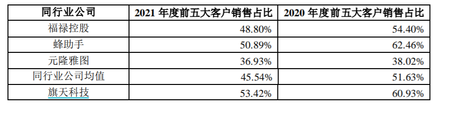 旗天科技存在着對部分客户較為依賴的情況。財報顯示,2020年、2021年旗天科技前五名客户銷售佔比分別為60.93%、53.42%。同一時期同行業公司均值分別為51.63%、45.54%。儘管2021年佔比有所下降,兩年銷售佔比均高於同行業均值。