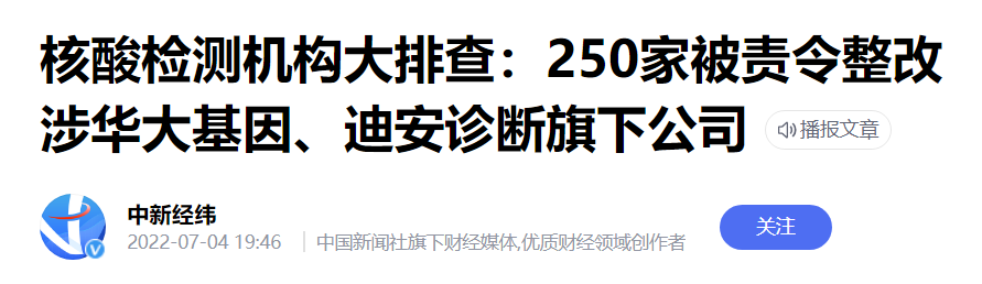 然後我花了很大力氣去追溯這個消息的來源,最後發現,這個消息來源是中新經緯一次不完全統計,今年6—7月,多個省市自治區對核酸檢測機構進行排查,有250家核酸檢測機構被責令整改,另有26家核酸檢測機構自行或者被責令暫停核酸檢測業務。