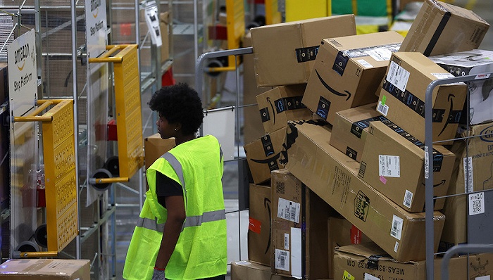 11月28日,美國喬治亞州,一名亞馬遜工作人員在亞馬遜送貨站推着一輛裝滿包裹的手推車。圖源:視覺中國