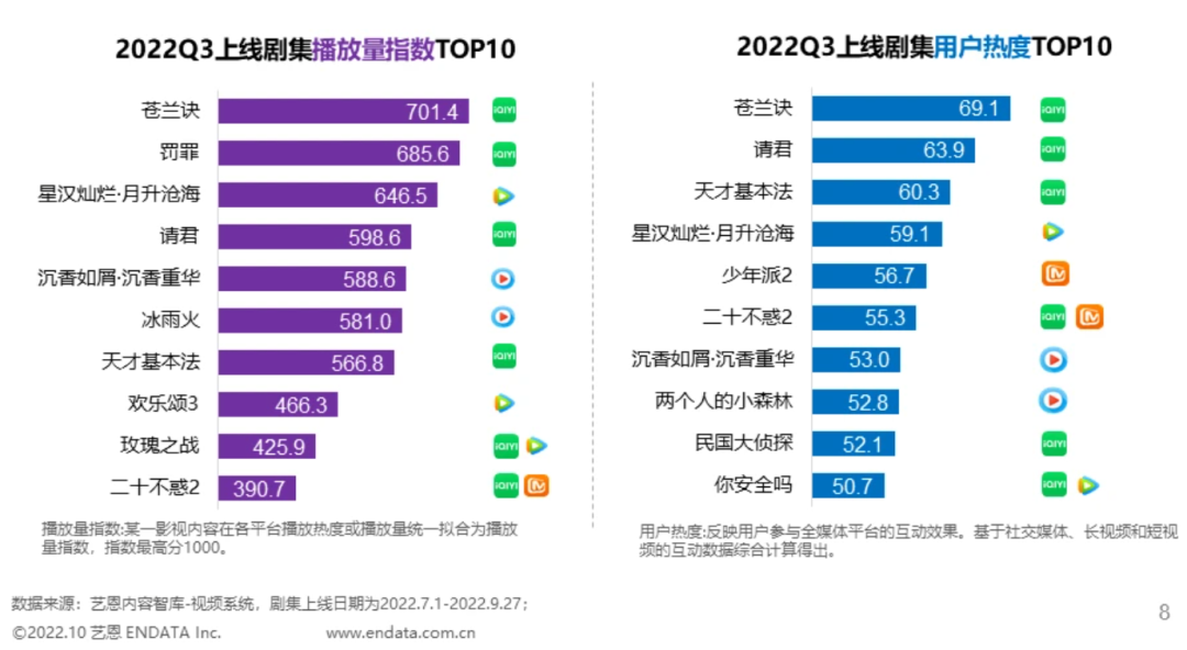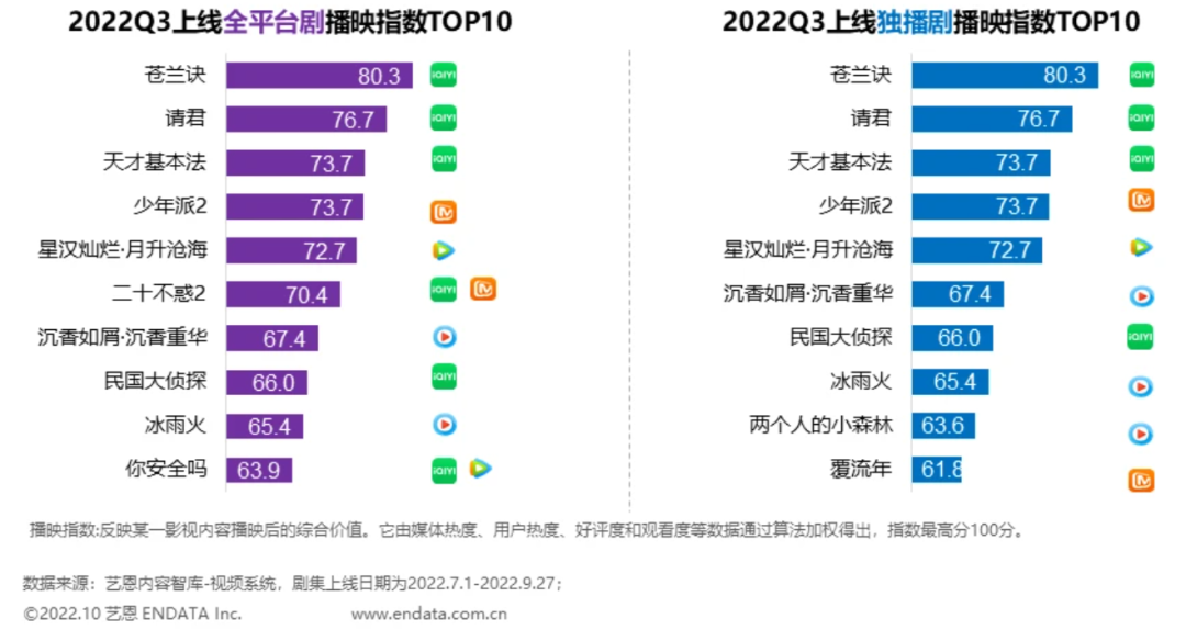 藝恩發佈的《2022Q3國產劇集市場研究報告》數據顯示,在衡量劇集傳播熱度的多個維度中,愛奇藝播出的劇集都佔據了更多的席位。