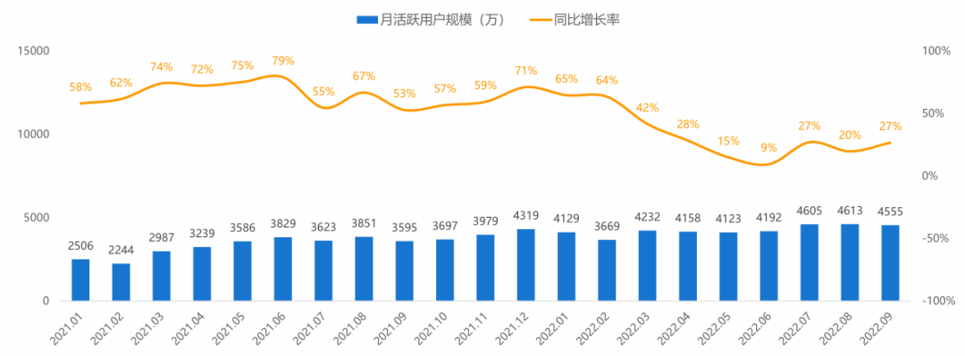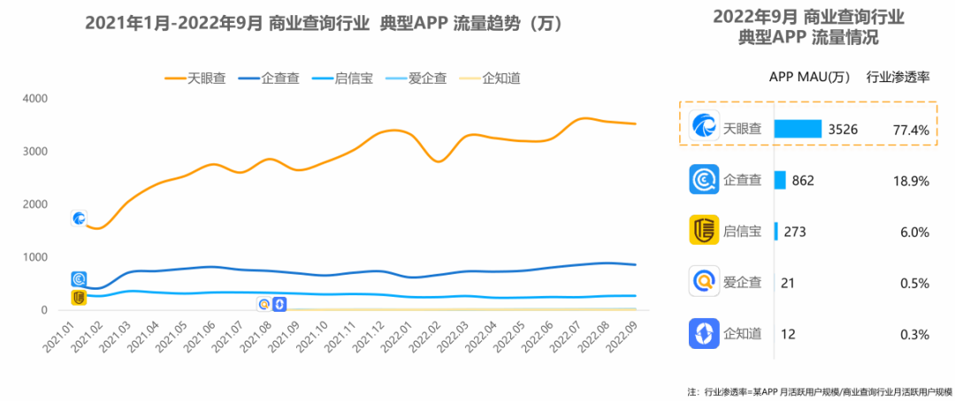 (圖:2021年1月-2022年9月商業查詢APP端行業月活躍用户規模(萬),資料來源:易觀分析)