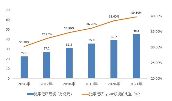 (圖:中國數字經濟規模已經佔到GDP比重的近4成,資料來源:信通院)
