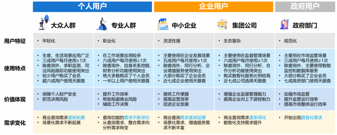 一般而言,商查用户分成專業人羣、大眾人羣、集團企業、中小企業、政府部門五種類型。不同用户在不同場景需要針對性的商查服務,更難的是,用户需求仍在不斷變化,這也是最考驗商查平台能力邊界的維度。