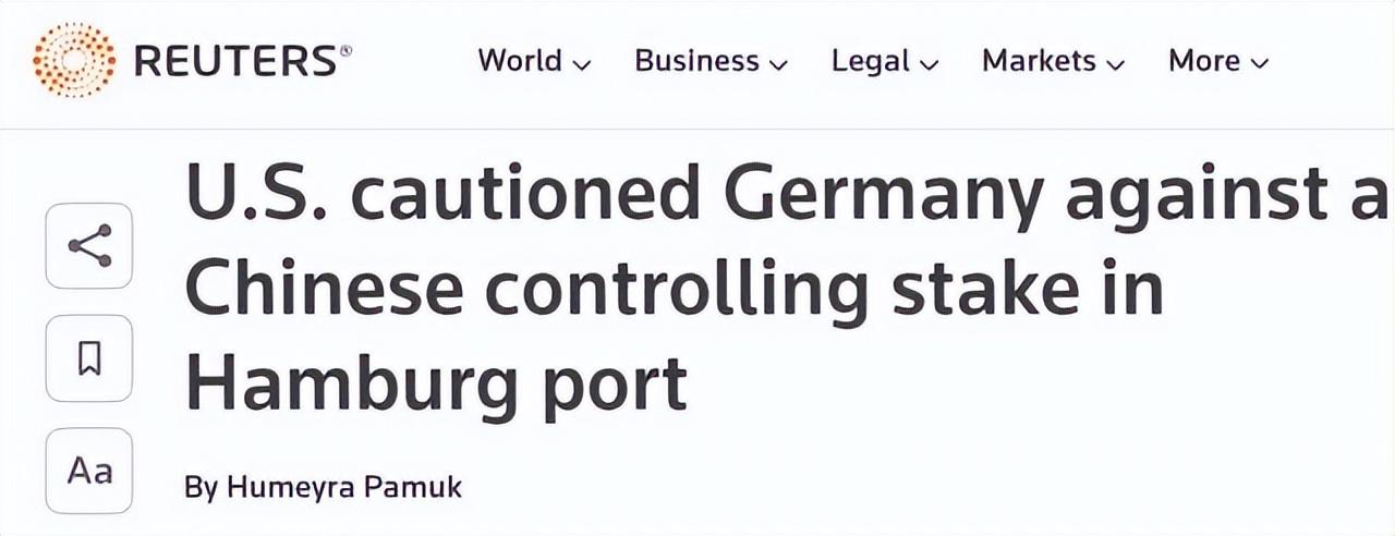 11月初,在德國政府批准中企投資漢堡港後,路透社隨即刊文表示美國國務院官員“自曝”,美方曾“強烈建議”德國政府不要讓中企對漢堡港的集裝箱碼頭持有控股權,並對德國方面施以巨大壓力。雖然從結果來看,德國政府面對施壓並未妥協,但也正因如此,反而需要在外交層面,動動口舌,配合一下美方。而且,需要特別注意,現階段的德國在某些層面有求於美國。