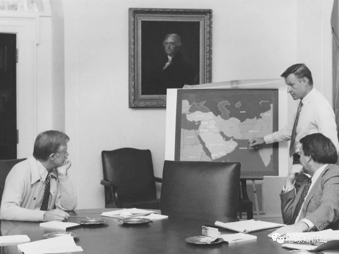 布熱津斯基就伊朗形勢向卡特(左一)作報告