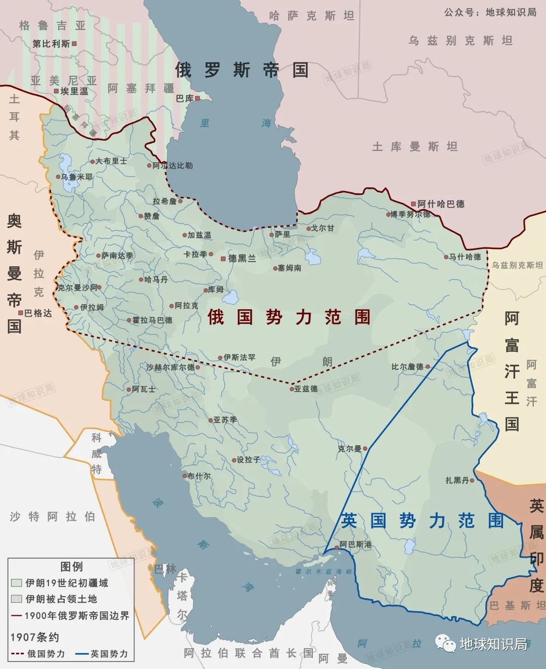 1907年,在中亞地區爭的頭破血流的英國人和俄國人簽訂了《英俄條約》。在條約中,雙方將整個伊朗一分為二,北部由俄國人控制,而包括波斯灣在內的南部則淪為了英國人的地盤。