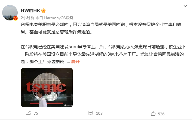 在台積電已經在美國建設5nm半導體工廠後,台積電創辦人張忠謀日前透露,該企業下一階段將在美國設立目前半導體最先進製程的3納米芯片工廠。尤其讓台灣網民崩潰的是,那個工廠旁邊據説還預留6個工廠的地盤。如果都跑去美國了,那台灣最大的產業也就是化為泡影了。