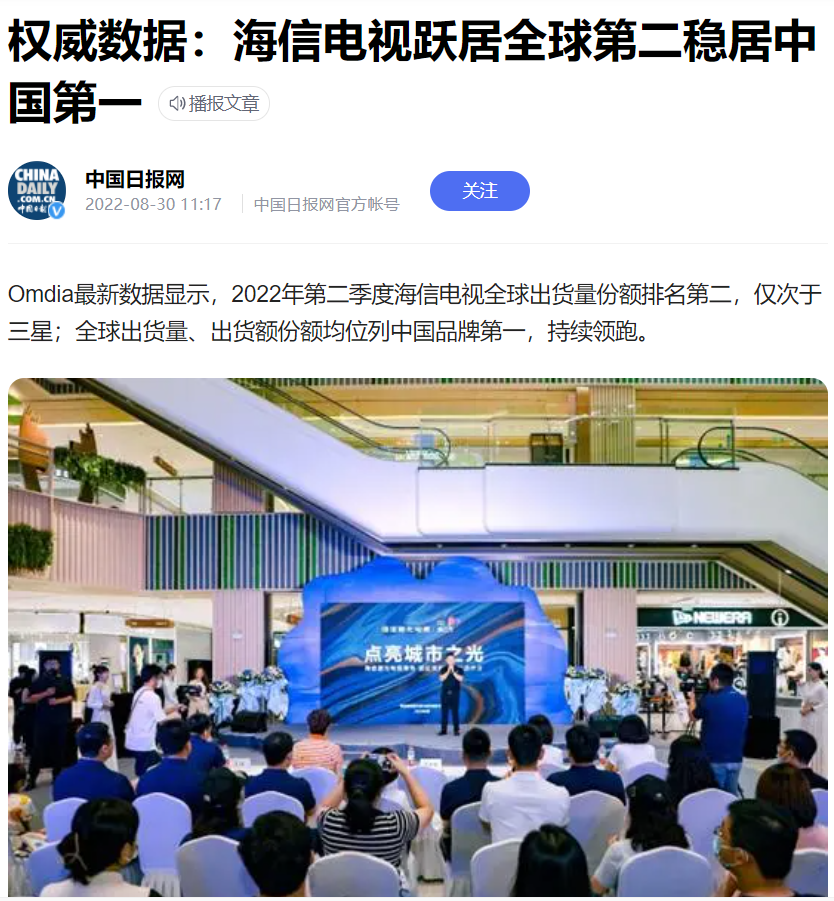 中國品牌首次!海信系電視2022年1-10月出貨量躍居世界第二